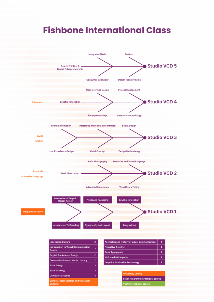 Visual Communication Design international class is one of the study programs in the Faculty of Creative Industries (FIK) of Telkom University. Based on the science of art, design, and technology, as well as other supporting sciences, Visual Communication Design provides education to produce visual communication design graduates who are qualified to master Information technology and local wisdom, and able to develop themselves into entrepreneurs in the field of design and creative industries (creativepreneurr). Graduates of the Visual Communication Design of Telkom University can create design works by prioritizing the process maturity and integration of their knowledge with other sciences so that they can be useful for the Visual Communication Design profession and science, the creative industry, and society. The rise of businesses in the creative and digital fields encourages Visual Communication Design-Telkom University to have two study concentrations, namely Technopreneurship and Multimedia Marketing. Technopreneurship concentration will focus on producing a technology-based visual product and creating a business. Meanwhile, Multimedia Marketing focuses on planning and researching visual product marketing. Visual Communication Design (DKV) is a science that bridges the communication of meaning through a visual medium. The academic disciplines are applied among others through practical and theoretical learning, which can bring an understanding of a design directly from the student’s experience. This study program does not only prepare students to earn a degree in the field of design but also promotes innovative thinking to encourage creative initiatives toward the implementation of design in everyday life.